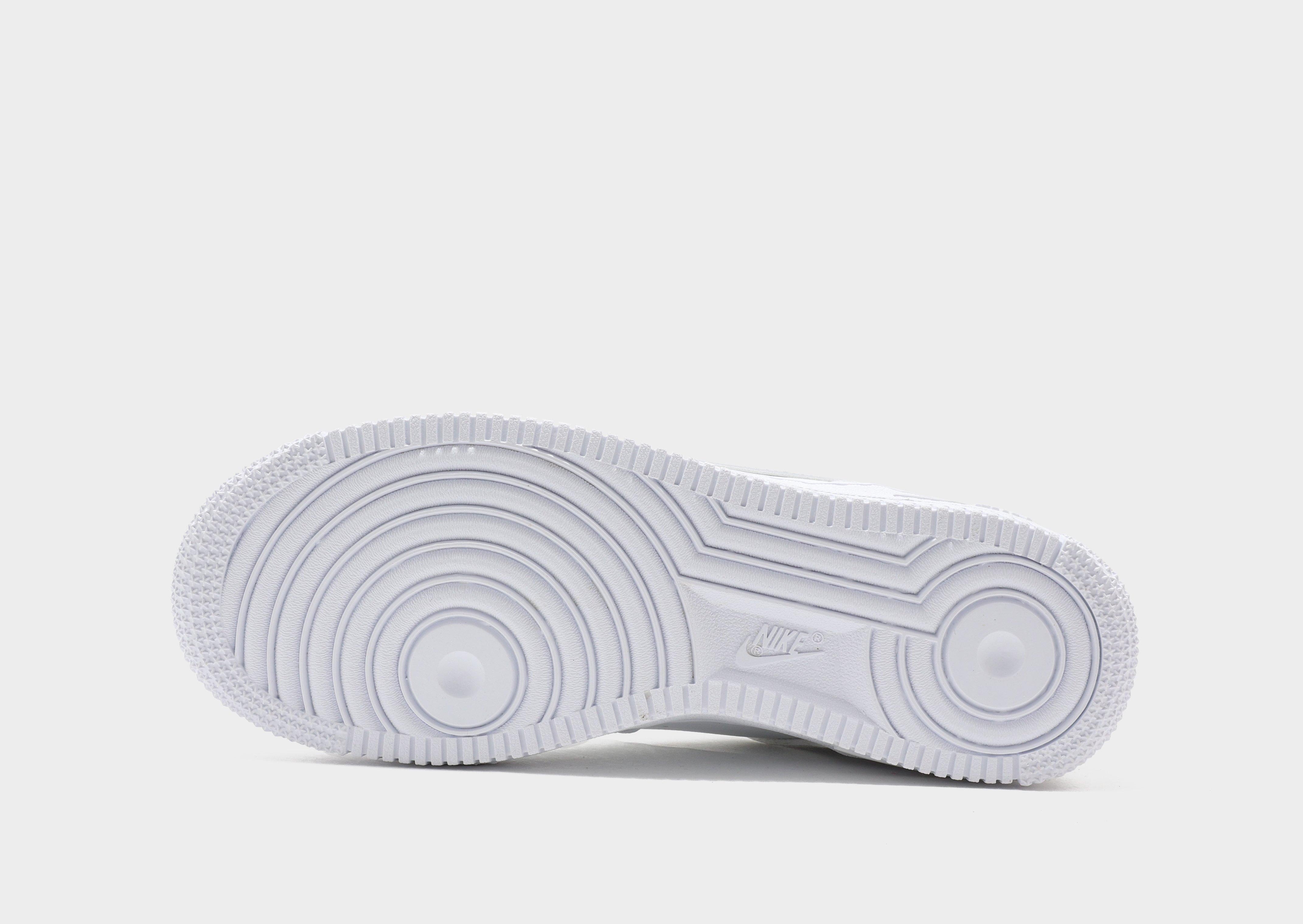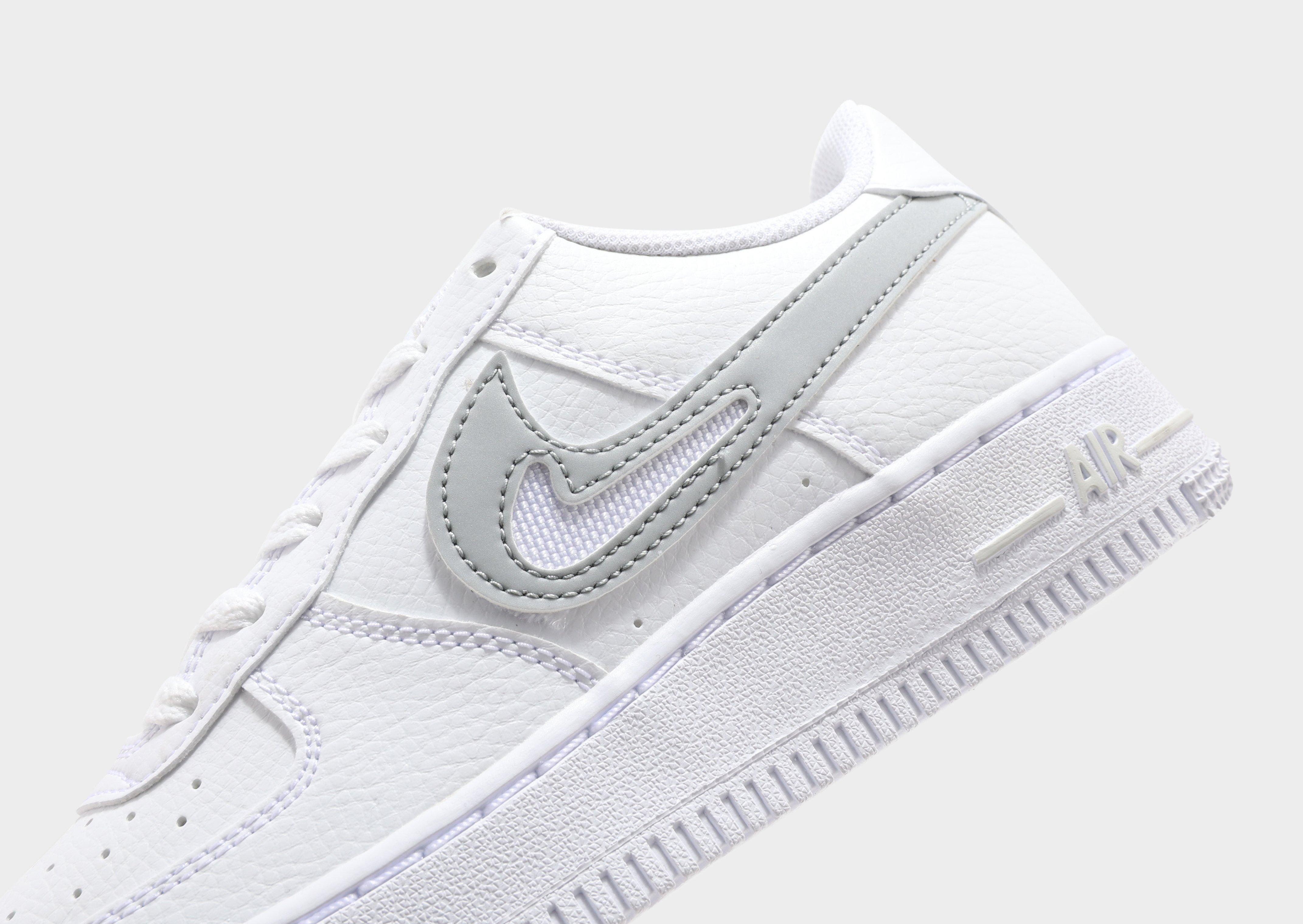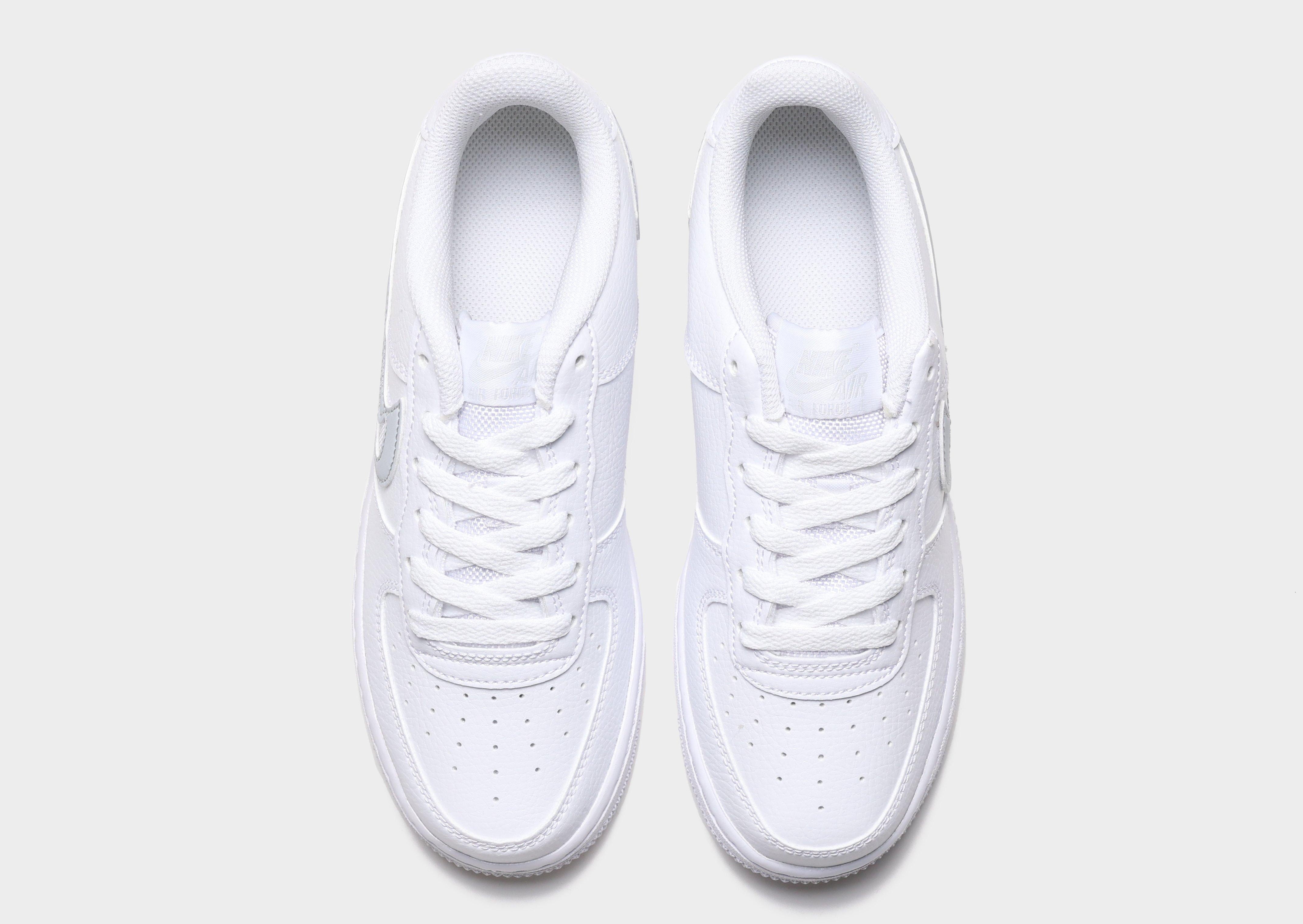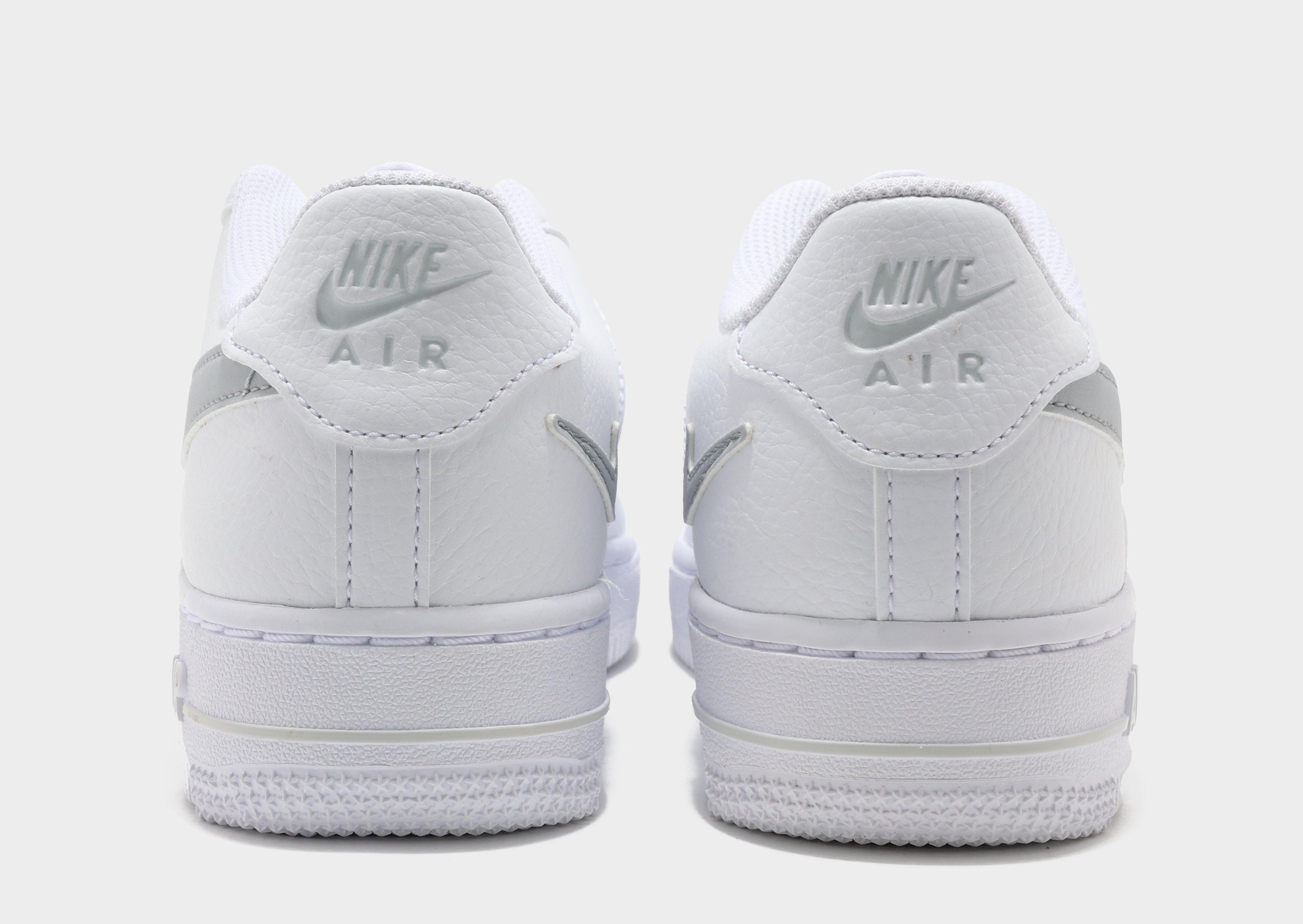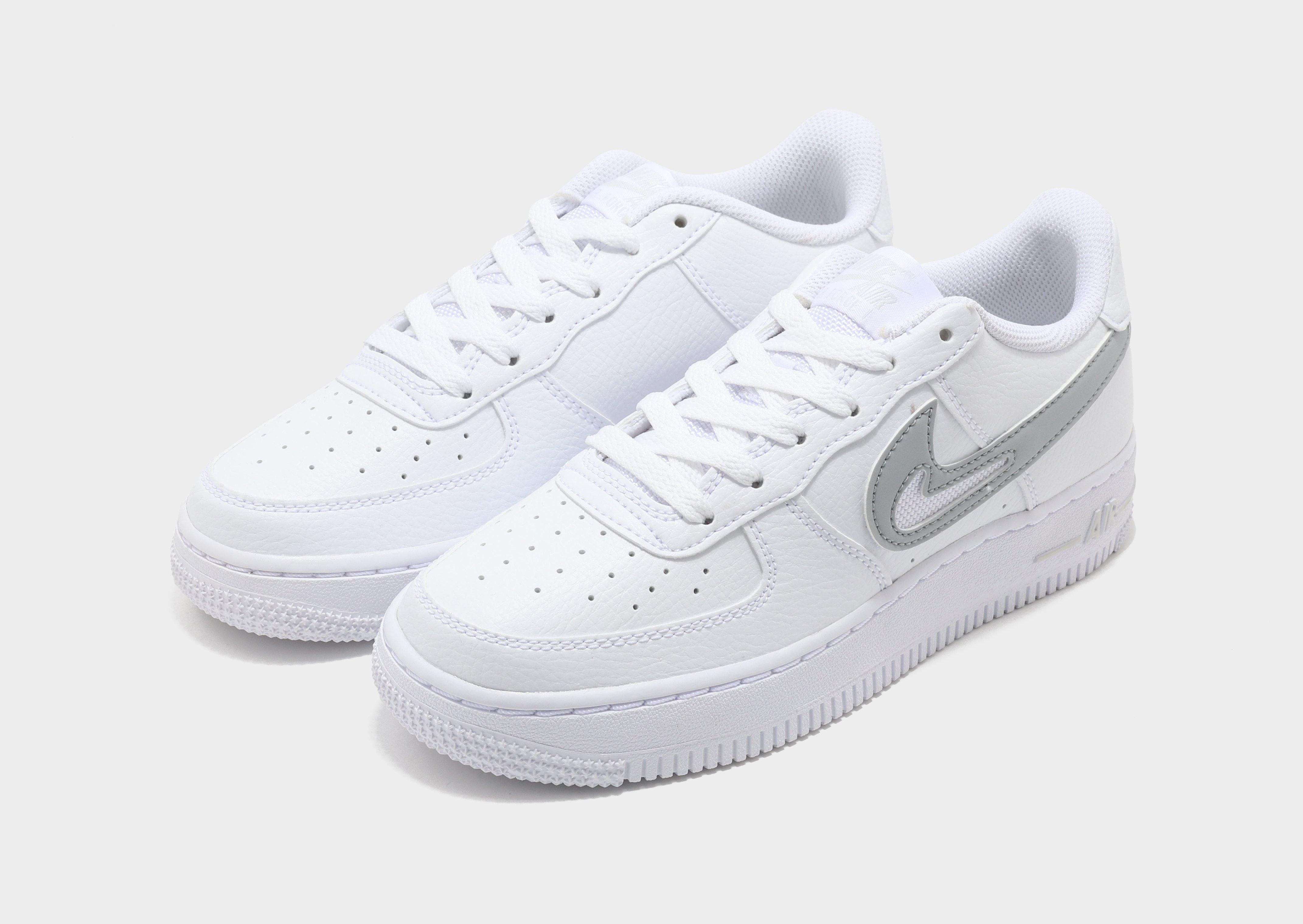 Upgrade your kicks with these juniors' Air Force 1 Low trainers from Nike. Exclusive to JD, in a White and Grey colourway, these low-profile kicks have a smooth but durable synthetic leather upper for lasting wear. They feature lace fastening with a plush, padded ankle collar to lock you in and have perforations to the toe for breathability. Underfoot is a soft and spongy foam midsole for cushioned comfort and a rubber outsole for traction. Signed off with the Swoosh to the sidewalls.