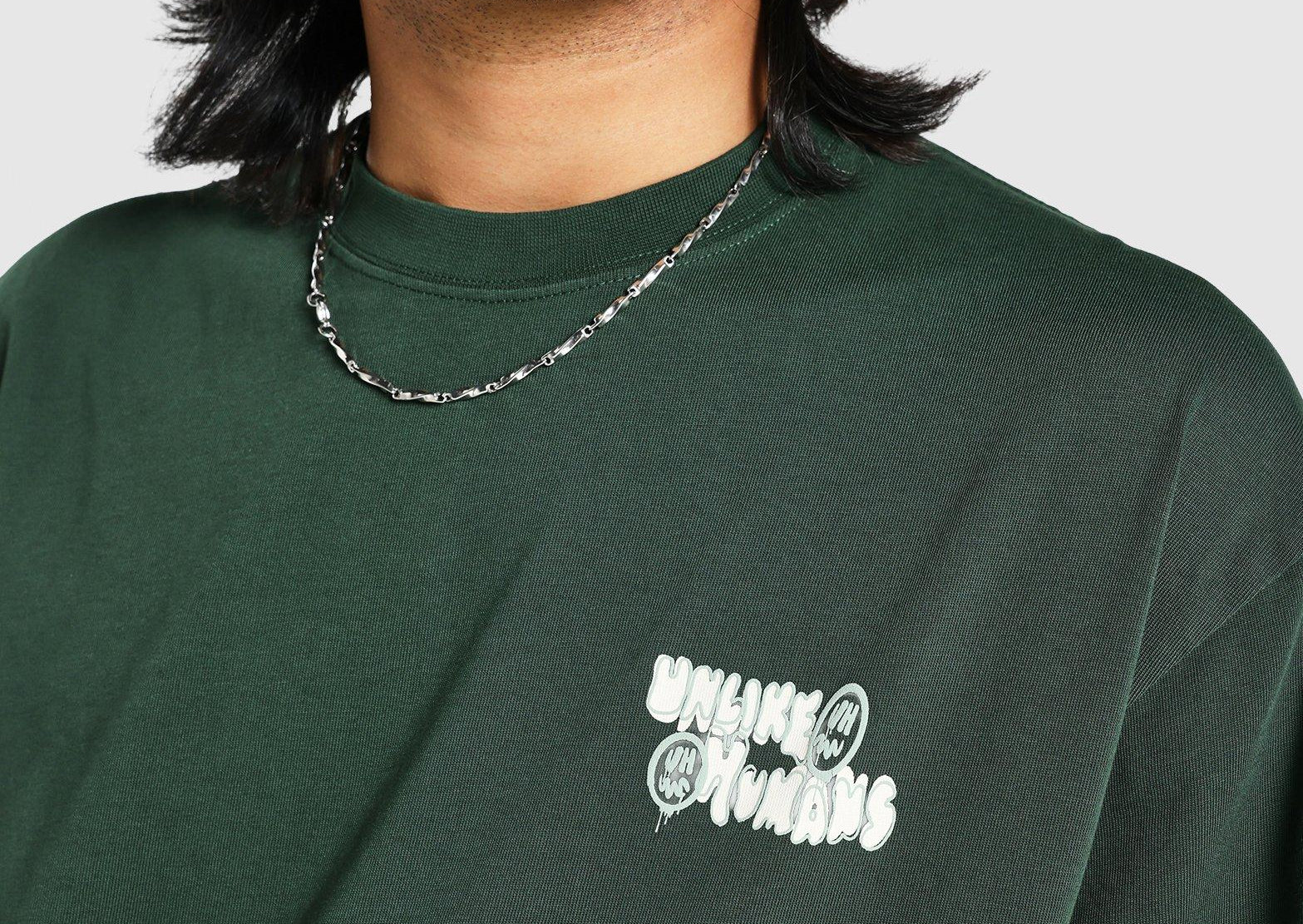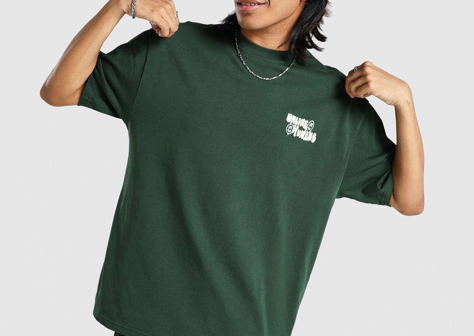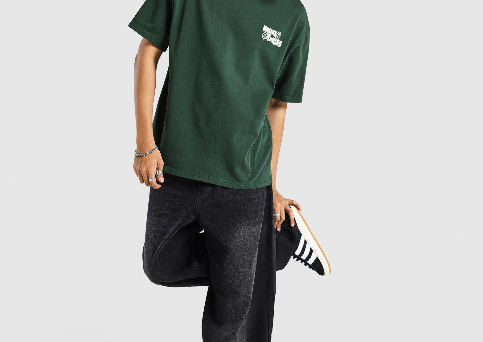 The UNLIKE HUMANS Hindsight Tee in Green delivers a fresh take on streetwear with its bold graphic expression and effortless comfort. Crafted from premium cotton fabric, it provides a soft and breathable feel ideal for everyday wear. The striking back print reflects the brand’s introspective yet playful attitude, while the relaxed fit and classic crew neckline make it a versatile staple. Perfect for pairing with jeans or cargos, this tee adds a thoughtful edge to your casual style.