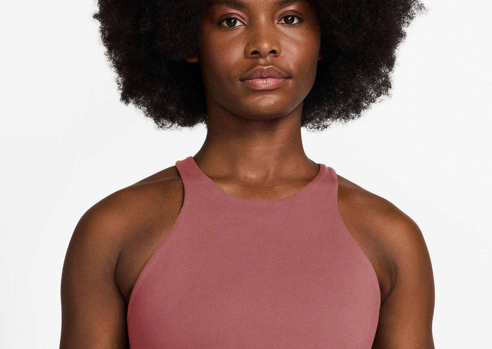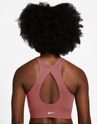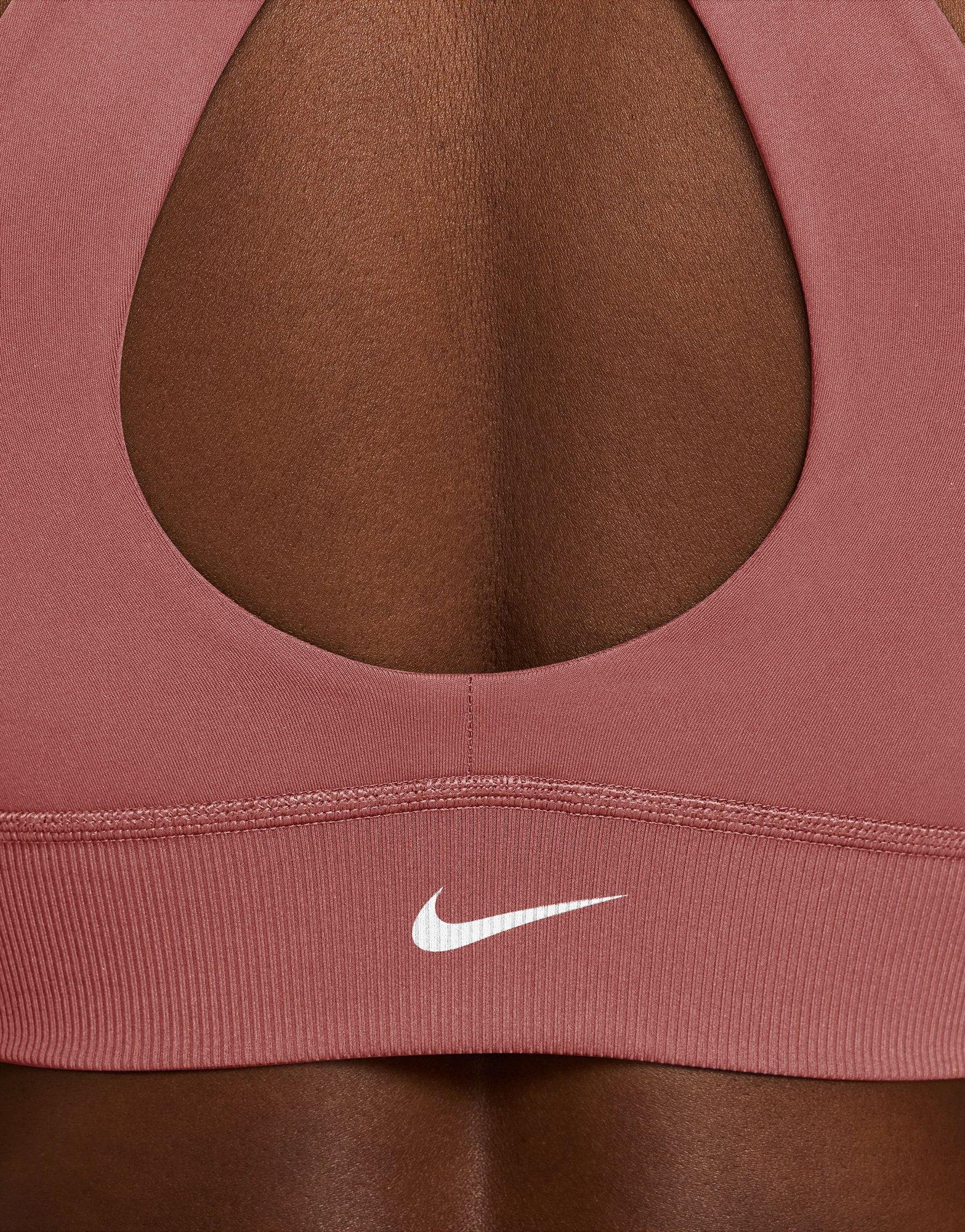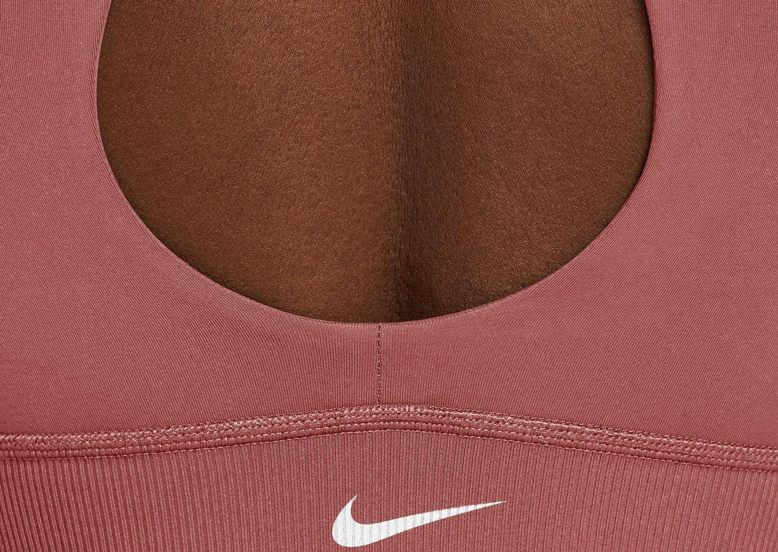 This Nike One bra offers high-neck coverage and comfort with a stylish twist. It's made with midweight, peachy-soft fabric that stretches with your every move and dries quickly. A ribbed chest band that crosses in the front gives you a fresh look, while light support gives you a gentle hold with plenty of freedom.