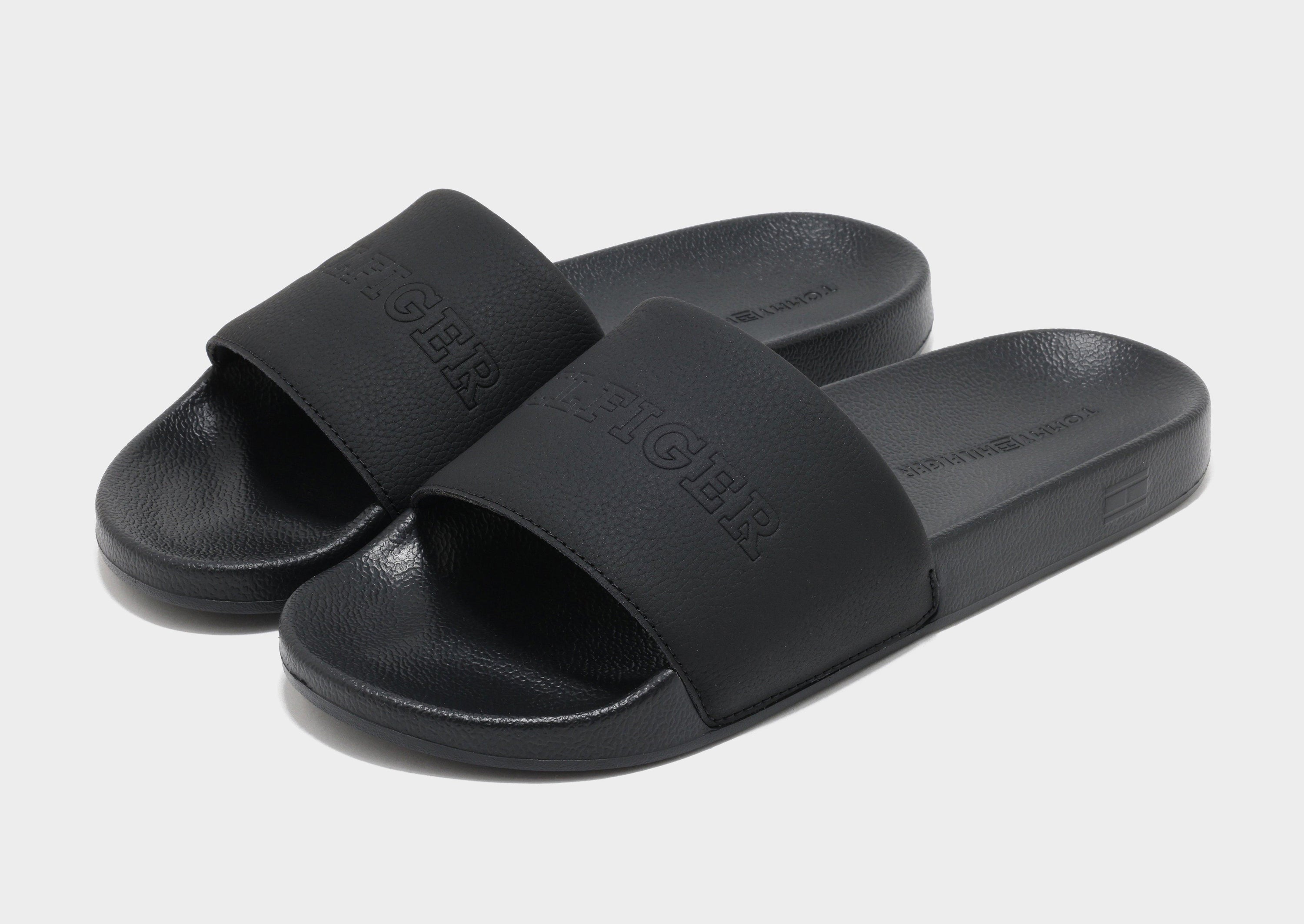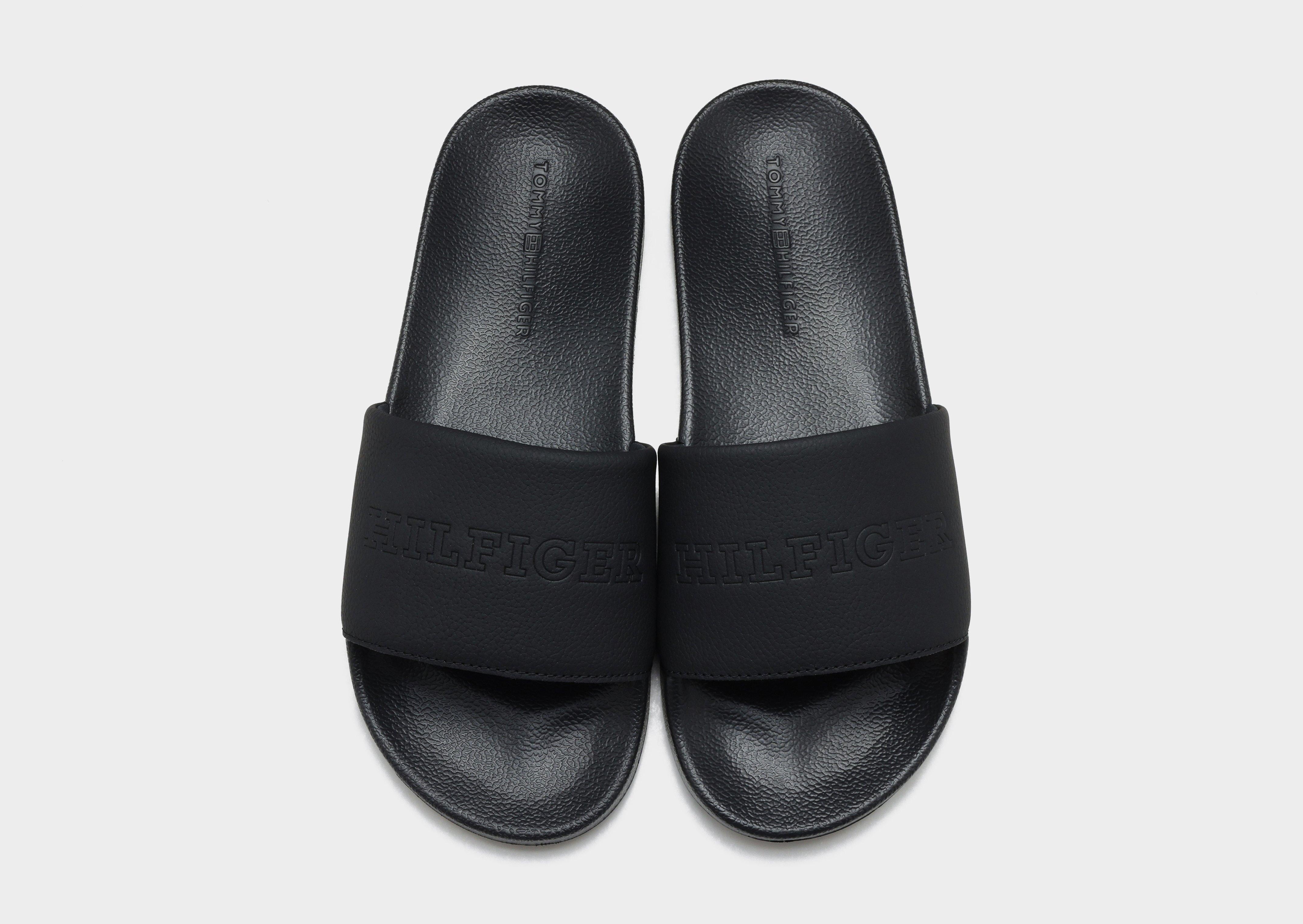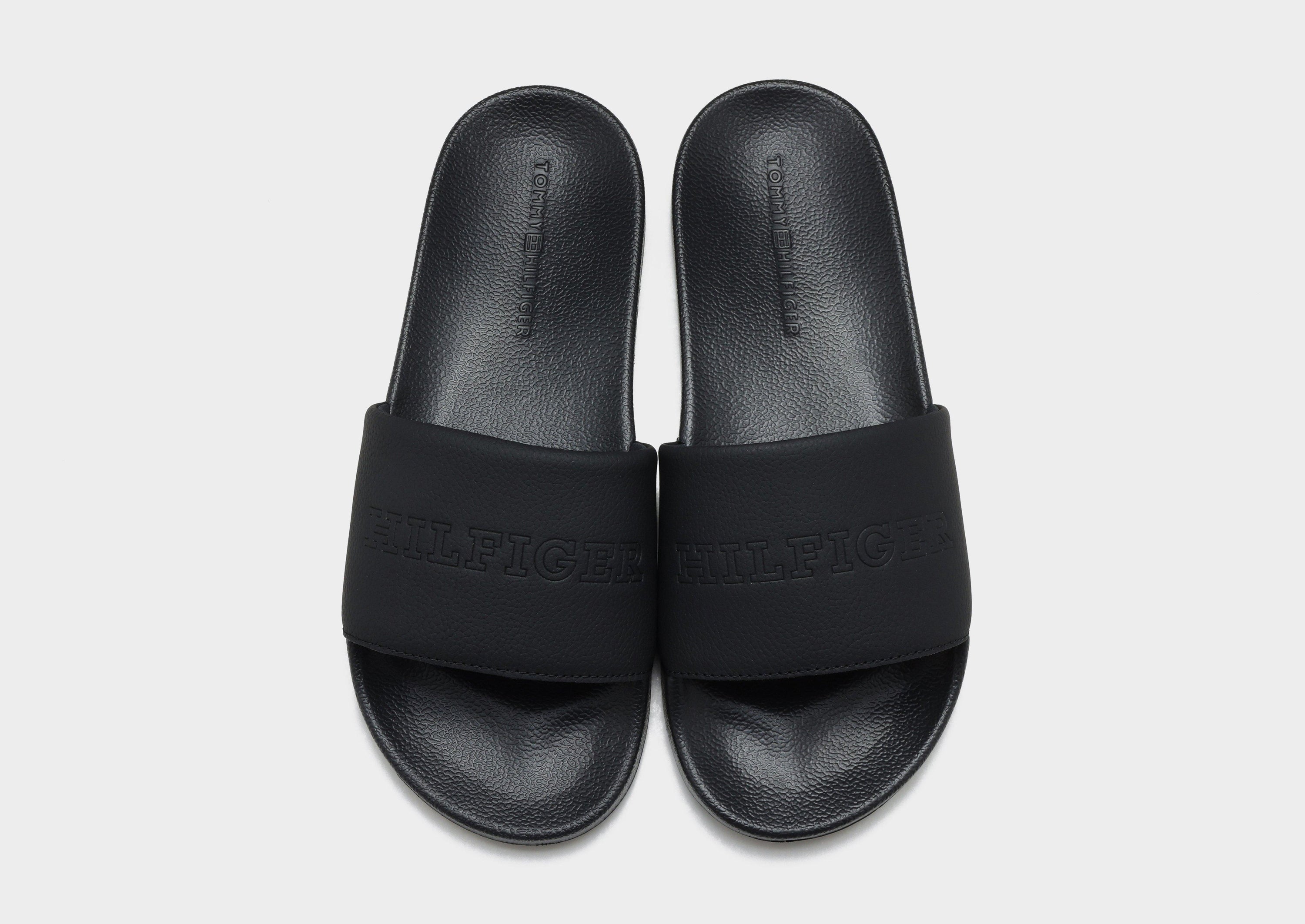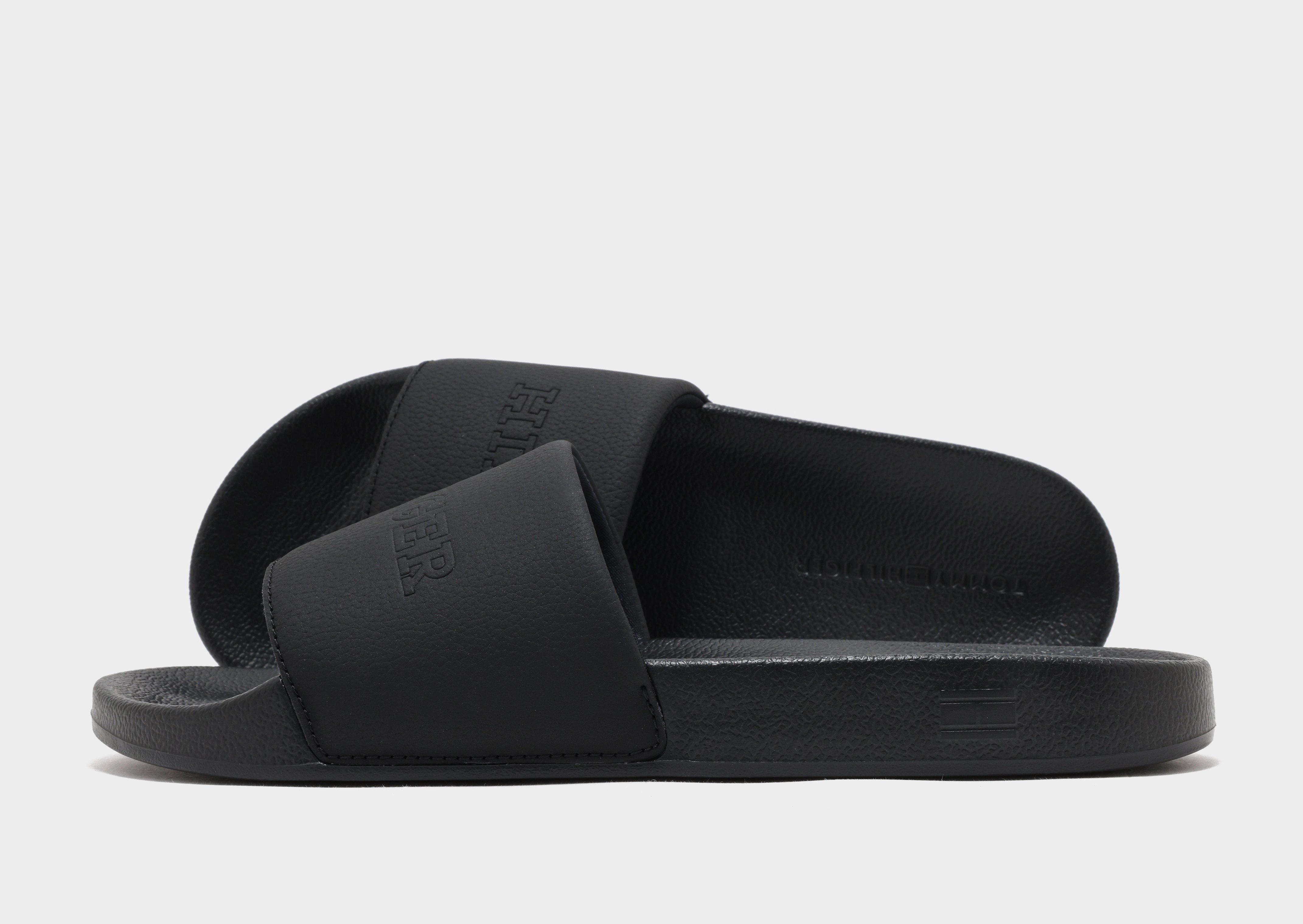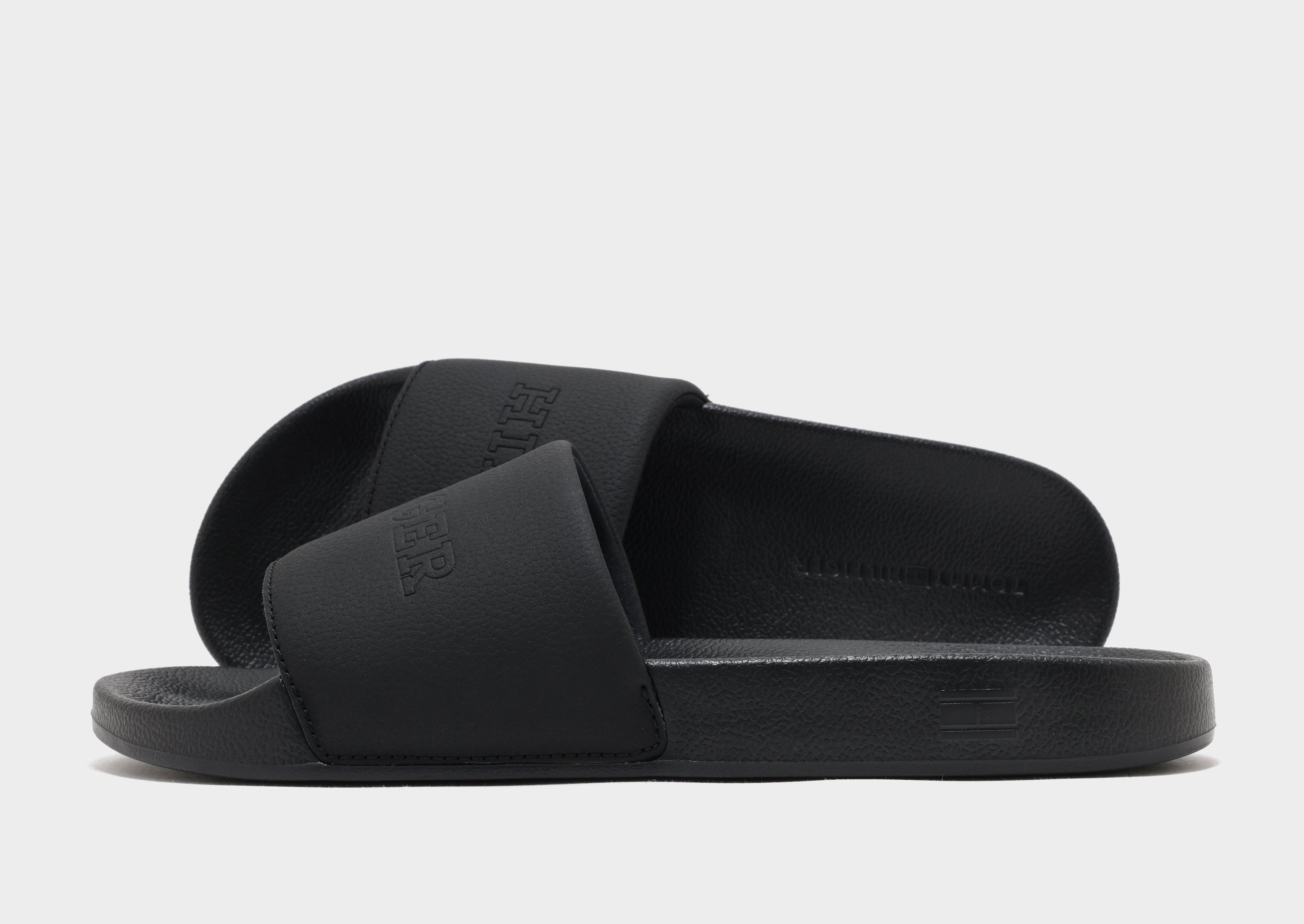Relax in effortless style with the Tommy Hilfiger TMBL Hilfiger Pool Slides in Black. These classic slides feature a smooth, contoured footbed that provides comfort and support with every step. The wide strap is adorned with the iconic Tommy Hilfiger logo for a signature look, while the lightweight, durable sole offers excellent traction on wet and dry surfaces. Perfect for poolside lounging, casual outings, or everyday wear, these slides combine comfort, versatility, and unmistakable Tommy Hilfiger style.