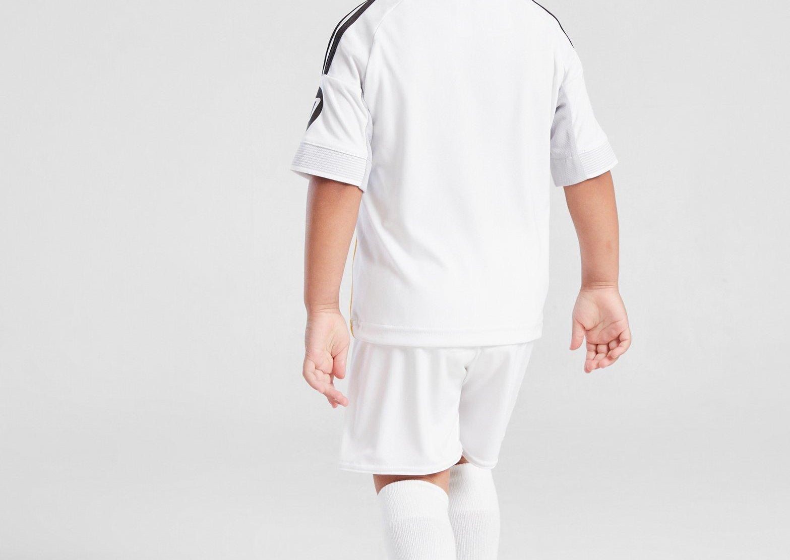 They'll look like a home team star in this Bernabéu-inspired Real Madrid kit for kids. Dressed in iconic white, this jersey, shorts and socks set celebrates the storied history of the club's legendary stadium with details inspired by its evolution. Moisture-managing AEROREADY keeps them dry and comfortable as they show their football skills.
