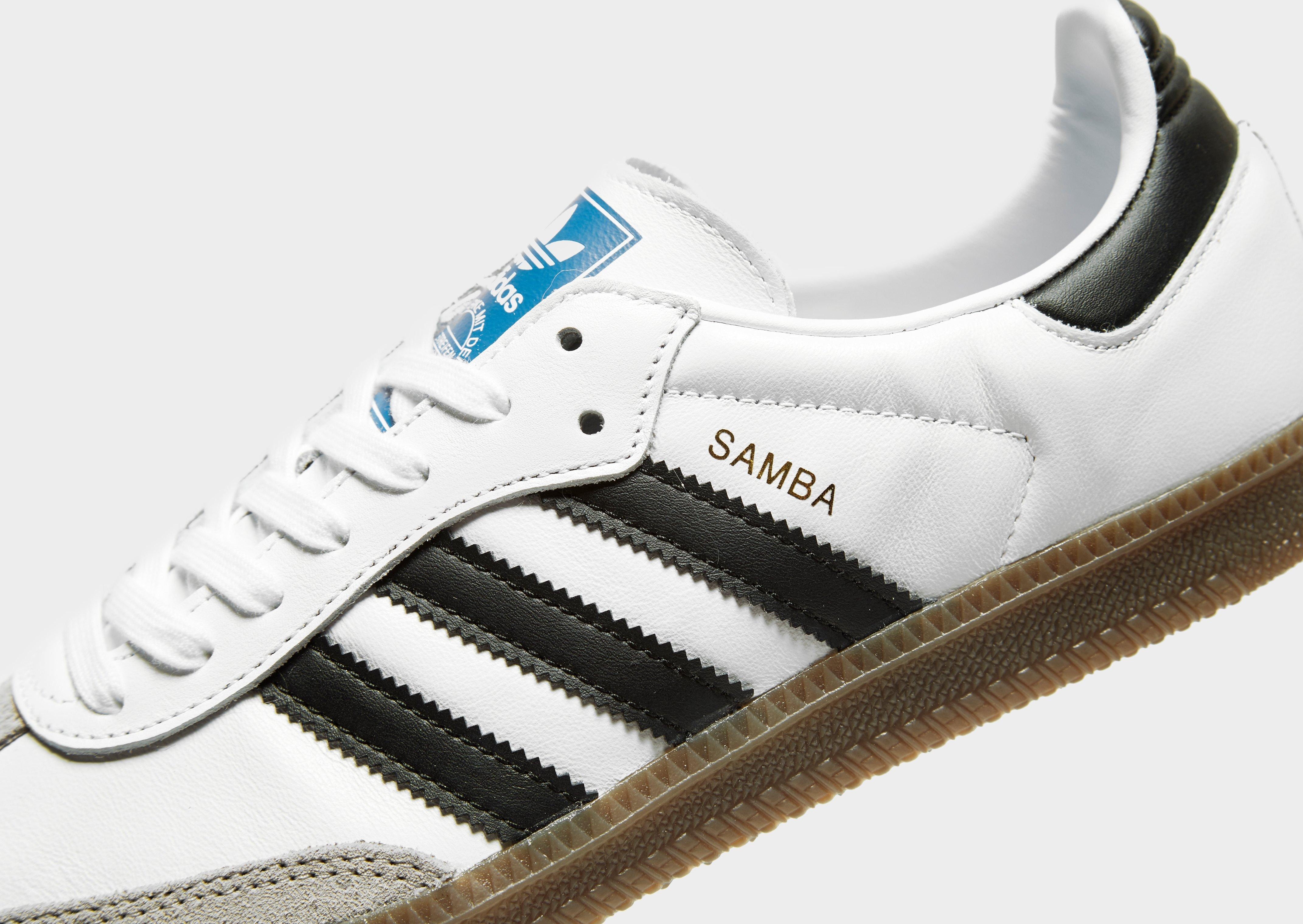 Get yourself some adi OG style with these men's Samba OG trainers from adidas Originals. Keeping its iconic 1950s style, these trainers take their cues from the original football-inspired Samba and are built with a white leather upper and a suede toe guard for premium support and comfort. Sat on a responsive gum midsole, they feature tonal laces and serrated 3-stripes to the sidewalls. Finished up with the golden SAMBA wordmark and Trefoil branding to the tongue.