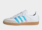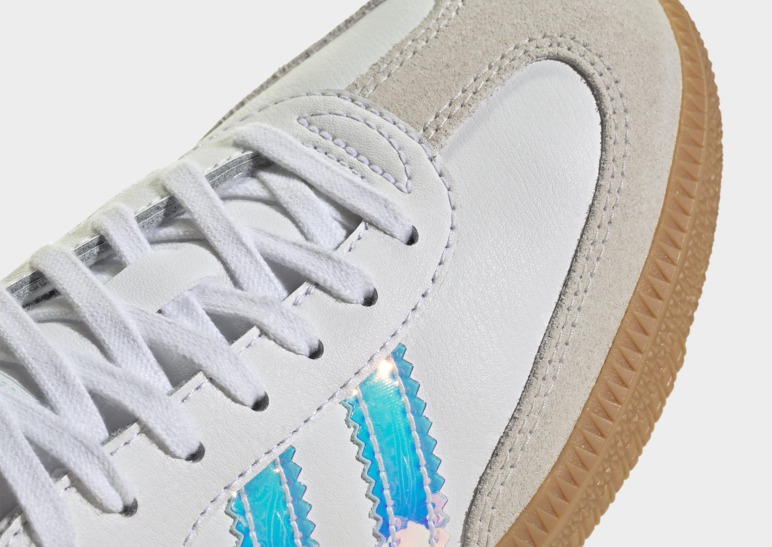 Meet the Samba OG, a timeless sneaker that has remained a favorite on football fields and skateparks alike. With a durable, breathable leather upper and a premium finish, this iconic shoe blends performance with everyday style. Inside, the Ortholite insole provides cushioned comfort and support, making every step feel light and easy. The signature suede T-toe adds to its classic, never-out-of-style silhouette, while iridescent rainbow stripes give it a fresh, versatile touch for any occasion. Whether you're out for a stroll or just keeping it casual, this adidas shoe is designed to keep you looking effortlessly stylish. Upper made from textile, insole lined with textile, and rubber outsole for grip and durability.