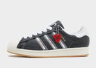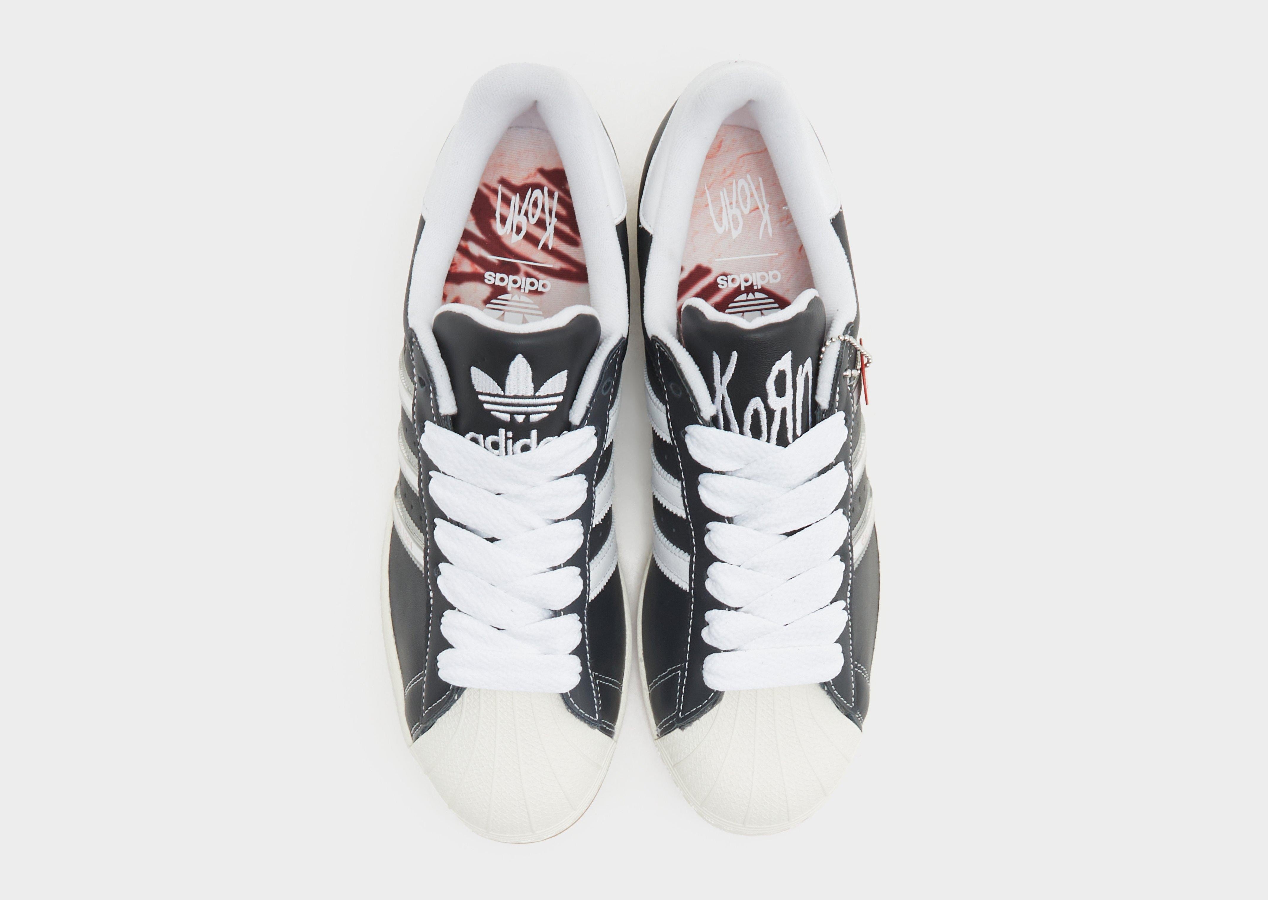 For over 50 years, the adidas Superstar shoes have paved the way for iconic street style. These shoes start with that history, a smooth leather upper and signature shell toe. This version of the legends are run through the metal press of Korn, celebrating 30 years since their debut album dropped in 1994. Korn x adidas is more than a collaboration — it's a celebration of creativity, authenticity and the power of self-expression. You're not lacing up a pair of shoes. You're lacing up raw energy.