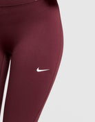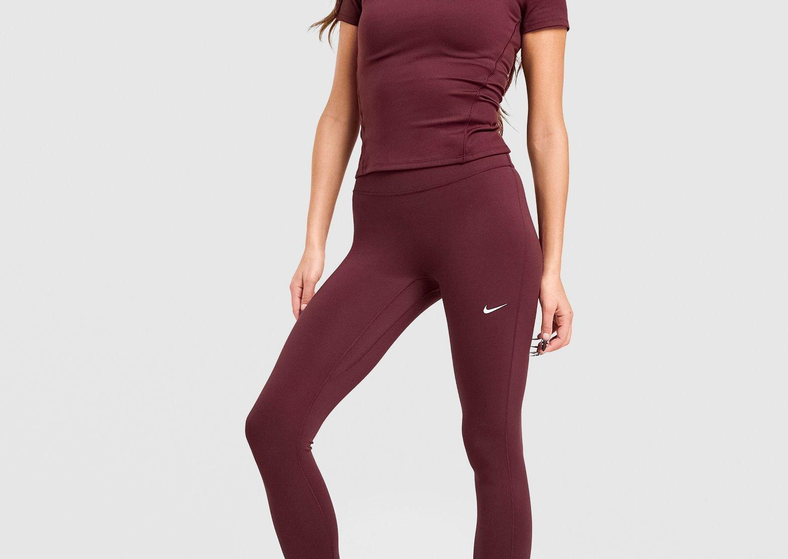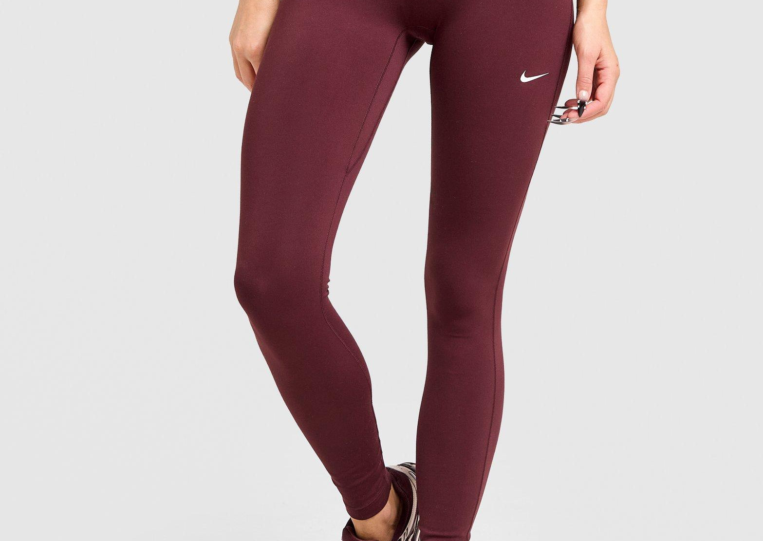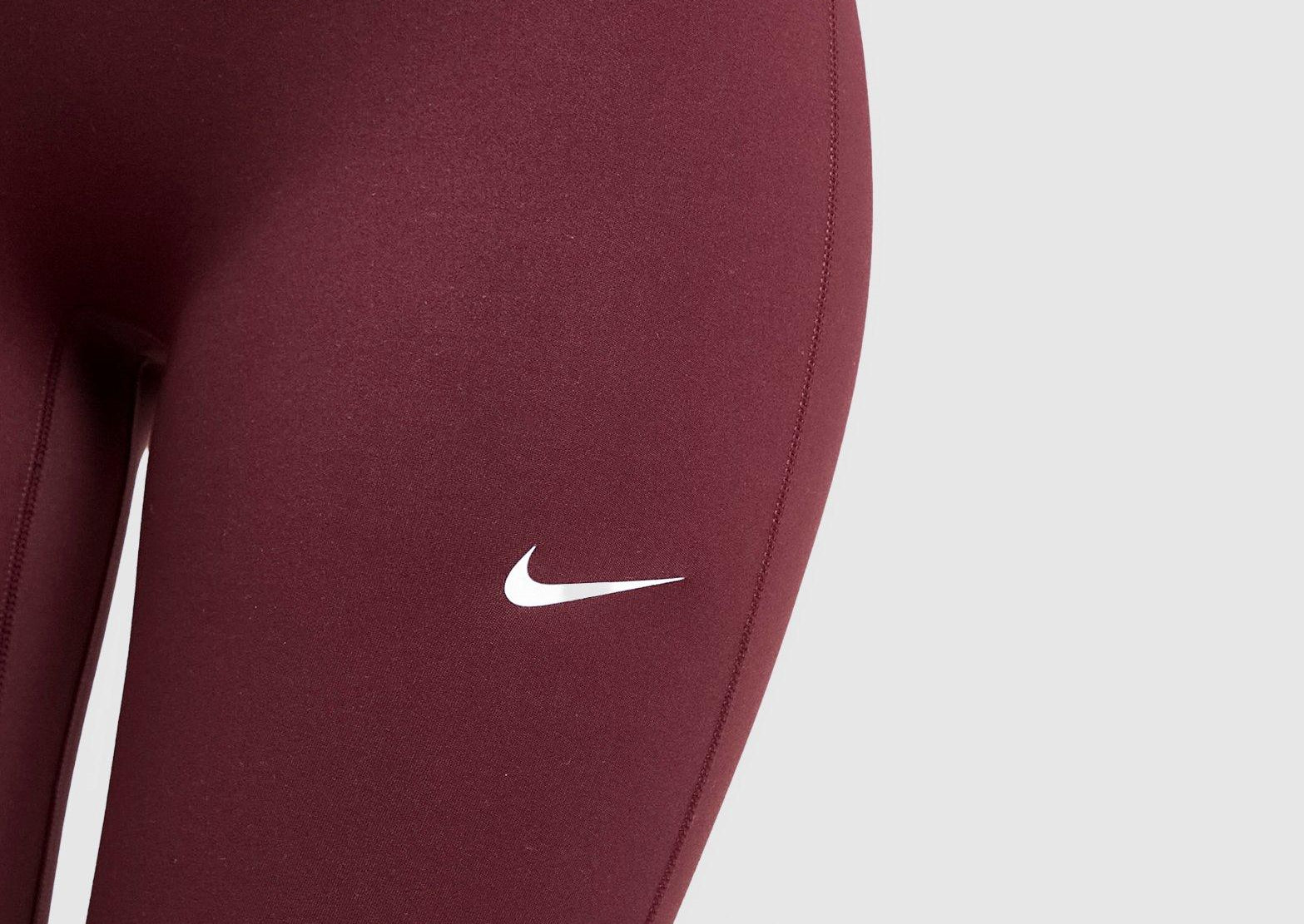 Your new go-to in or out of the gym. These women's Training One Seamless Leggings from Nike land in Burgundy Crush. Extra stretch and a seam-free front keeps you moving without restriction. The high-rise waist feels secure at the core. And Dri-FIT tech controls sweat. Finished up with the Swoosh logo at the thigh. Machine washable. | Our model is 5'7" and wears a size S.